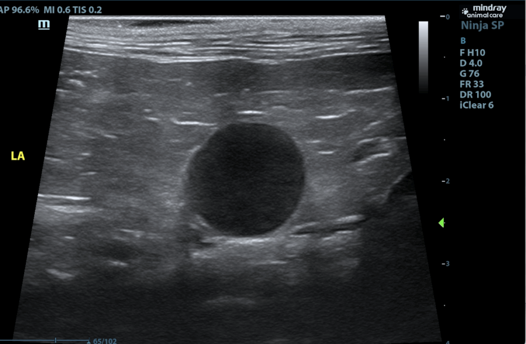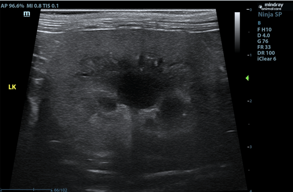Thank you to Dr. Selena Lusk of Stewart’s Mountain View Animal Hospital for her excellent case management and recommendation of additional diagnostic testing to investigate a possible underlying systemic disease. Thanks to Dr. Kathleen Byrnes, SDEP® Clinical Sonographer with Carolina Mobile fueled by SonoPath for her expert imaging, and the proficiency of SonoPath specialist Beth Johnson, DVM, DACVIM, allowing identification of the root cause as a left adrenal mass.