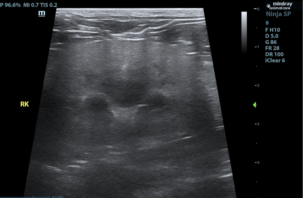 The urinary bladder is adequately distended with anechoic contents. No masses, inflammatory changes, echogenic sediment or cystoliths are observed. The urinary bladder, trigone and visible pelvic urethra are normal in thickness with a smooth mucosal surface. Kidneys are normal in size and contour. A relatively uniform hyperechogenicity is observed with mildly decreased corticomedullary distinction. There is no pyelectasia noted and no mineral is observed. No overt masses/nodules are observed. The left kidney measures 4.19 cm. The right kidney measures 4.33 cm.