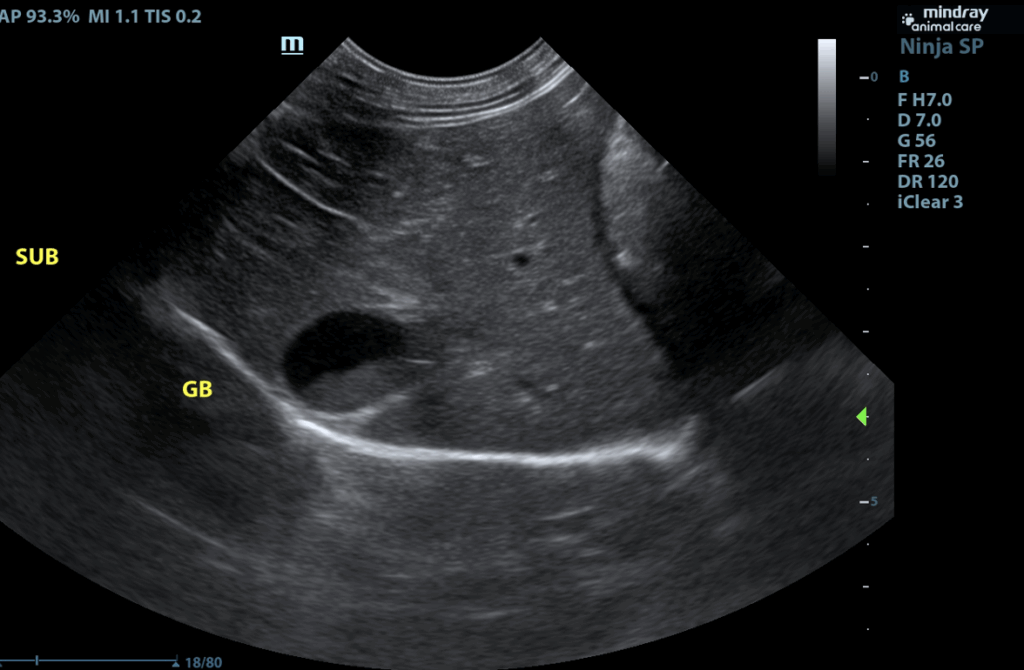 The liver is subjectively normal in size with normal smooth curvilinear peripheral contour. Parenchyma is appropriately hypoechoic to the spleen in echogenicity and appropriately mildly coarse and homogenous in echotexture. No focal lesions are observed. Visible vasculature and biliary tree appear normal without distension or congestion. Gallbladder is moderately distended with anechoic bile as well as suspended and gravity dependent echogenic debris. The wall is smooth without visible thickening. There is no evidence of cystic or CBD dilation. There is no evidence of effusion or inflammation.