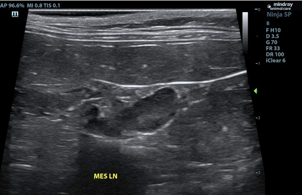 - Very mild reactive mesenteric lymph nodes – infiltrative neoplastic disease cannot be ruled out but is considered less likely.